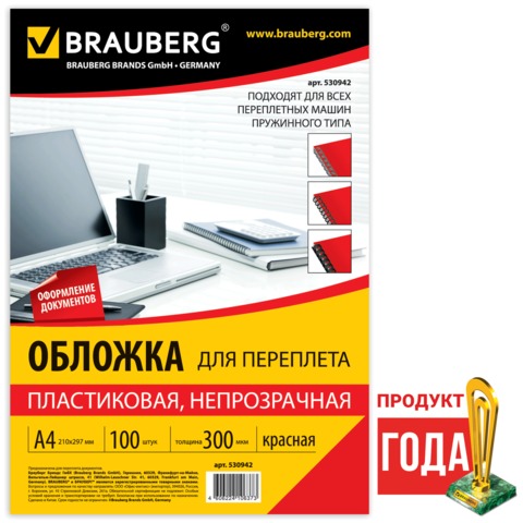 Обложки для переплета BRAUBERG, комплект 100 шт., А4, пластик 300 мкм, красные, 530942