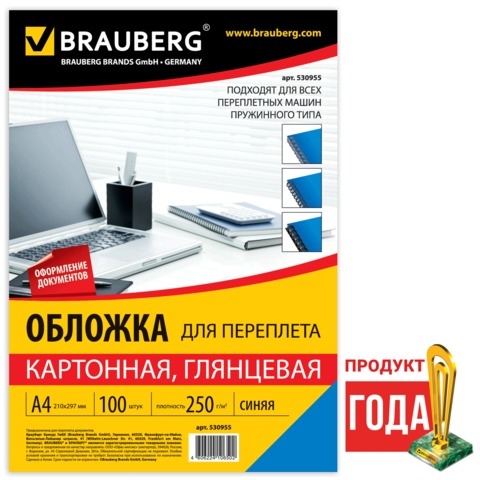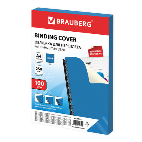 Обложки для переплета BRAUBERG, комплект 100 шт., глянцевые, А4, картон 250 г/м2, синие, 530955