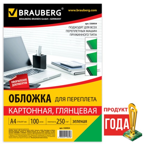 Обложки для переплета BRAUBERG, комплект 100 шт., глянцевые, А4, картон 250 г/м2, зеленые, 530954