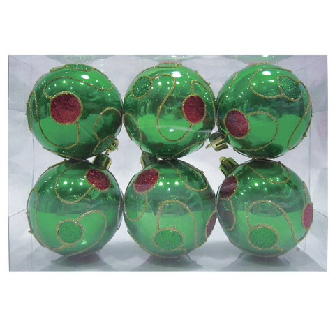 Шары елочные, набор 6 шт., пластик, диаметр 6 см, с рисунком, цвет зеленый (глянец), 59586