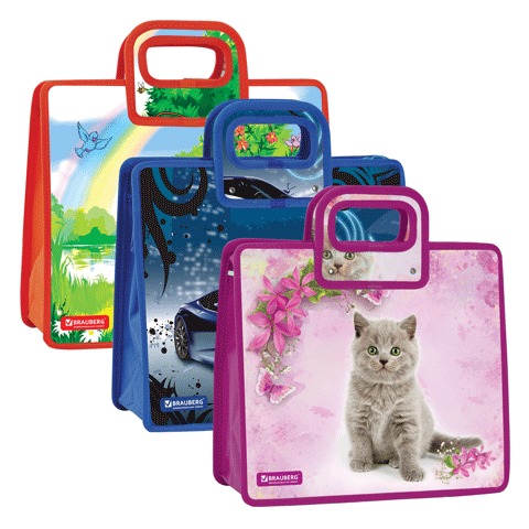 Сумка пластиковая BRAUBERG, ассорти "Ралли, Котенок, Собачки", 1 отделение, на молнии, 34х30х13 см