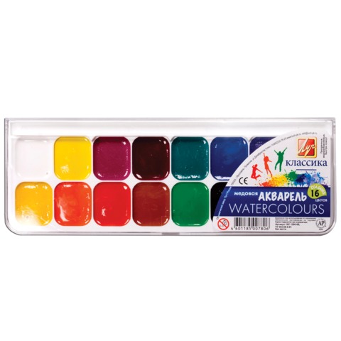 Краски акварельные изготовлены на основе органических пигментов и натурального связующего с добавлением пчелиного мёда. Предназначены для детского творчества и различных живописных работ. Отличаются хорошей прозрачностью, яркостью и чистотой цвета.