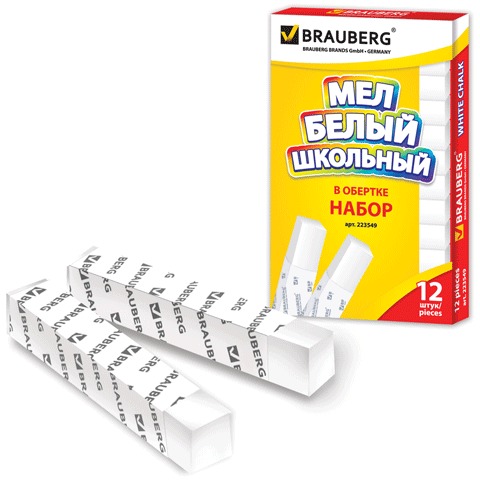 Мел белый BRAUBERG, набор 12 шт., квадратный с оберткой, 223549